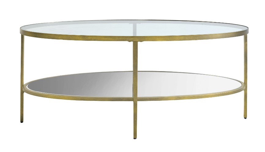 Stunning oval metal coffee table in an aged champagne finish with inlaid, tempered glass top and mirrored shelf.