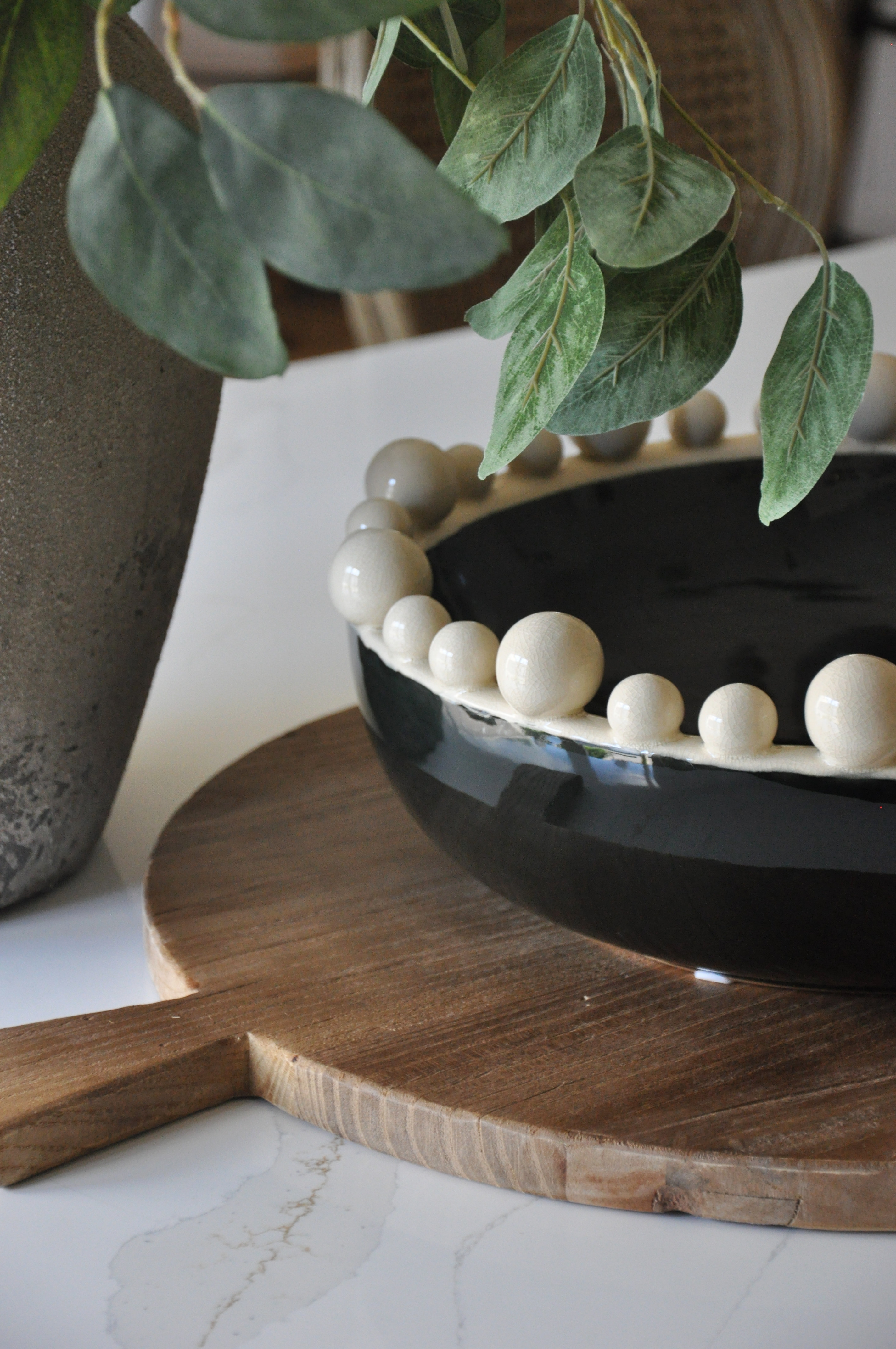 Striking contrast meets playful texture in the Cream and Black Ceramic Bobble Bowl. This eye-catching ceramic piece features a two-tone finish—sleek black paired with soft cream—and a signature bobble-trimmed rim for added dimension. Whether styled as a centrepiece or layered with other décor, it adds a bold yet balanced touch to any setting.