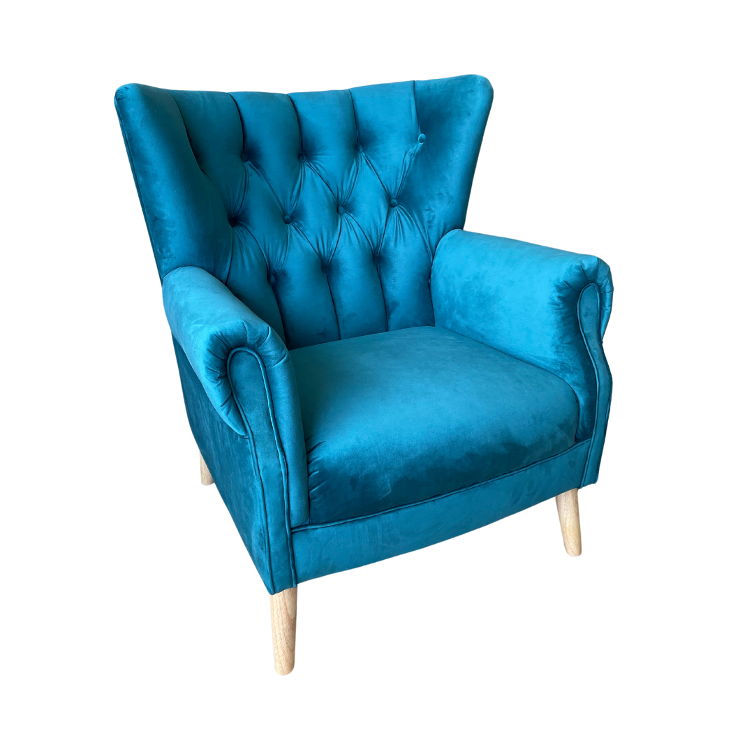 Elegant and inviting, the Grace armchair features a high winged back, deep button tufting, and gently rolled arms for a timeless silhouette. Upholstered in soft velvet and supported by tapered wooden legs, it brings both comfort and charm to any interior. Perfect for reading corners, living rooms, or bedrooms.