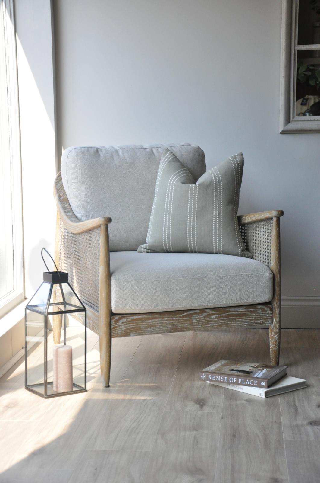 This beautiful rattan chair is the epitome of comfort and style. Featuring beautifully detailed arms and an attractive spindle back, there's not one part of this piece that cannot be admired. Upholstered in a clean linen blend fabric, this chair has been designed to suit a multitude of spaces.