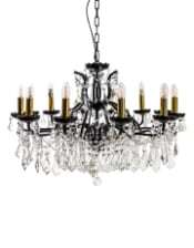 A striking statement piece, this chandelier showcases twelve elegant arms finished in luxurious matt black, adorned with glistening clear crystal droplets for a touch of timeless glamour. Designed with a shallow profile, it's perfect for creating impact in spaces with lower ceilings while maintaining an airy feel. Includes interchangeable matt black and gold candle sleeves, offering two distinctive looks to complement your interior style.