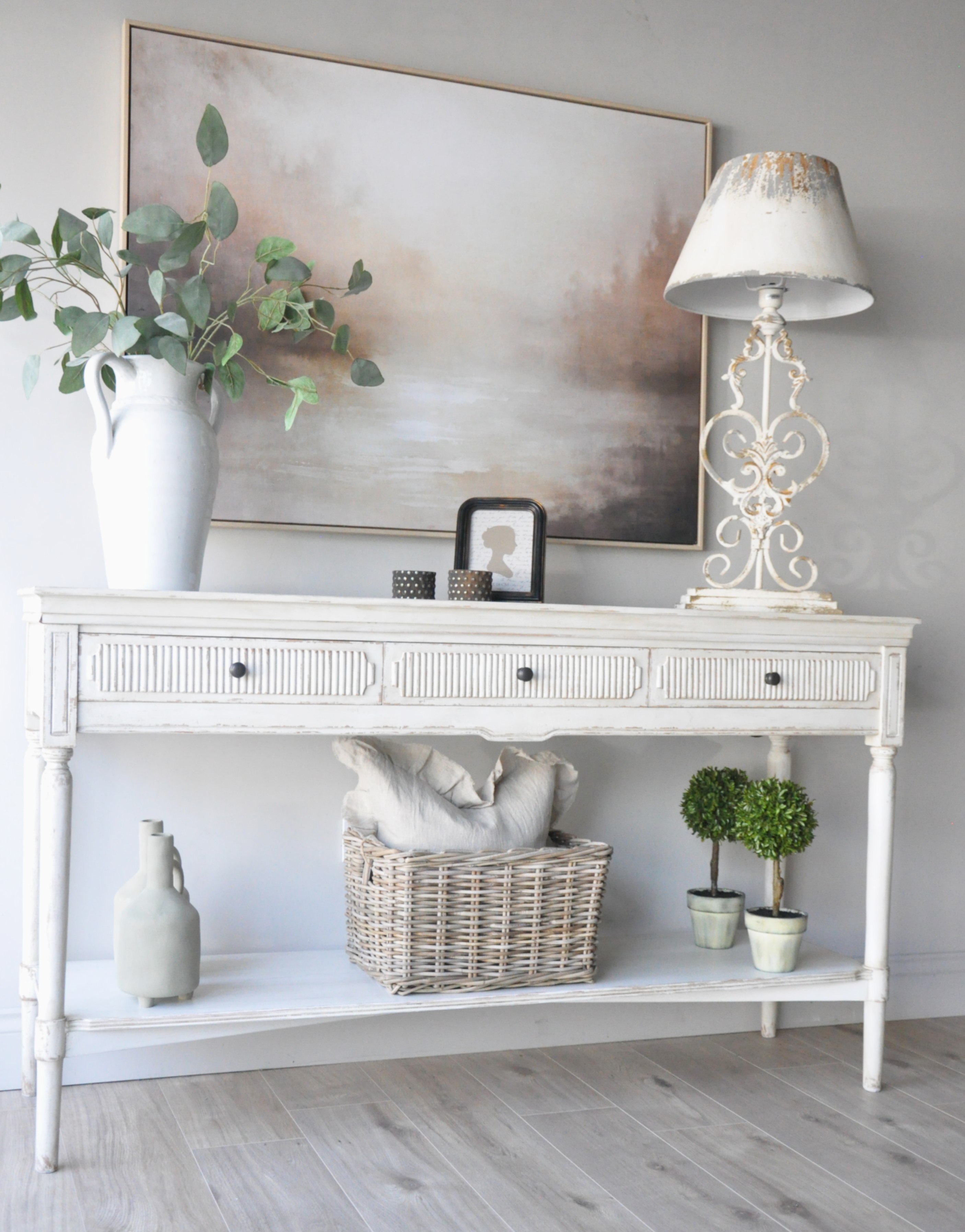Elegant and full of character, the Lois Hall Table is inspired by classic French design. Featuring fluted detailing, turned legs, and an antique white distressed finish, it brings a refined vintage charm to any space. The three drawers offer practical storage, while the lower shelf provides room for decorative display. Perfect for hallways, living rooms, or dining areas seeking a touch of timeless elegance.