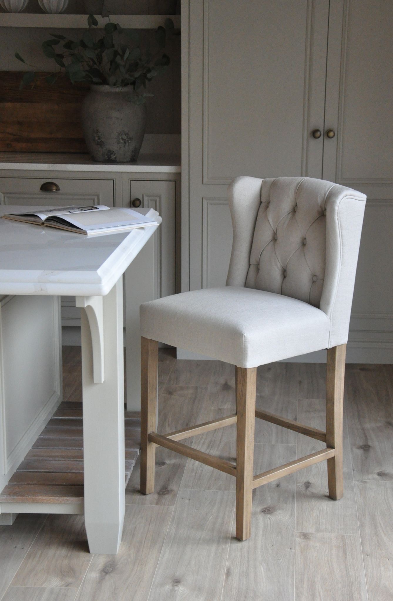 Our Nova Counter Stool is upholstered in a beautiful Beige Linen, classic in shape these are the perfect fit for any decor scheme. Solid Wood Frame with Oak washed legs.
