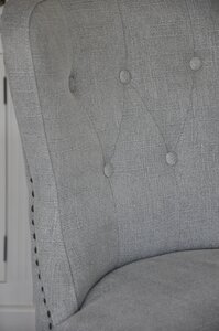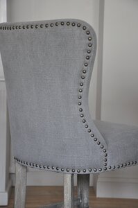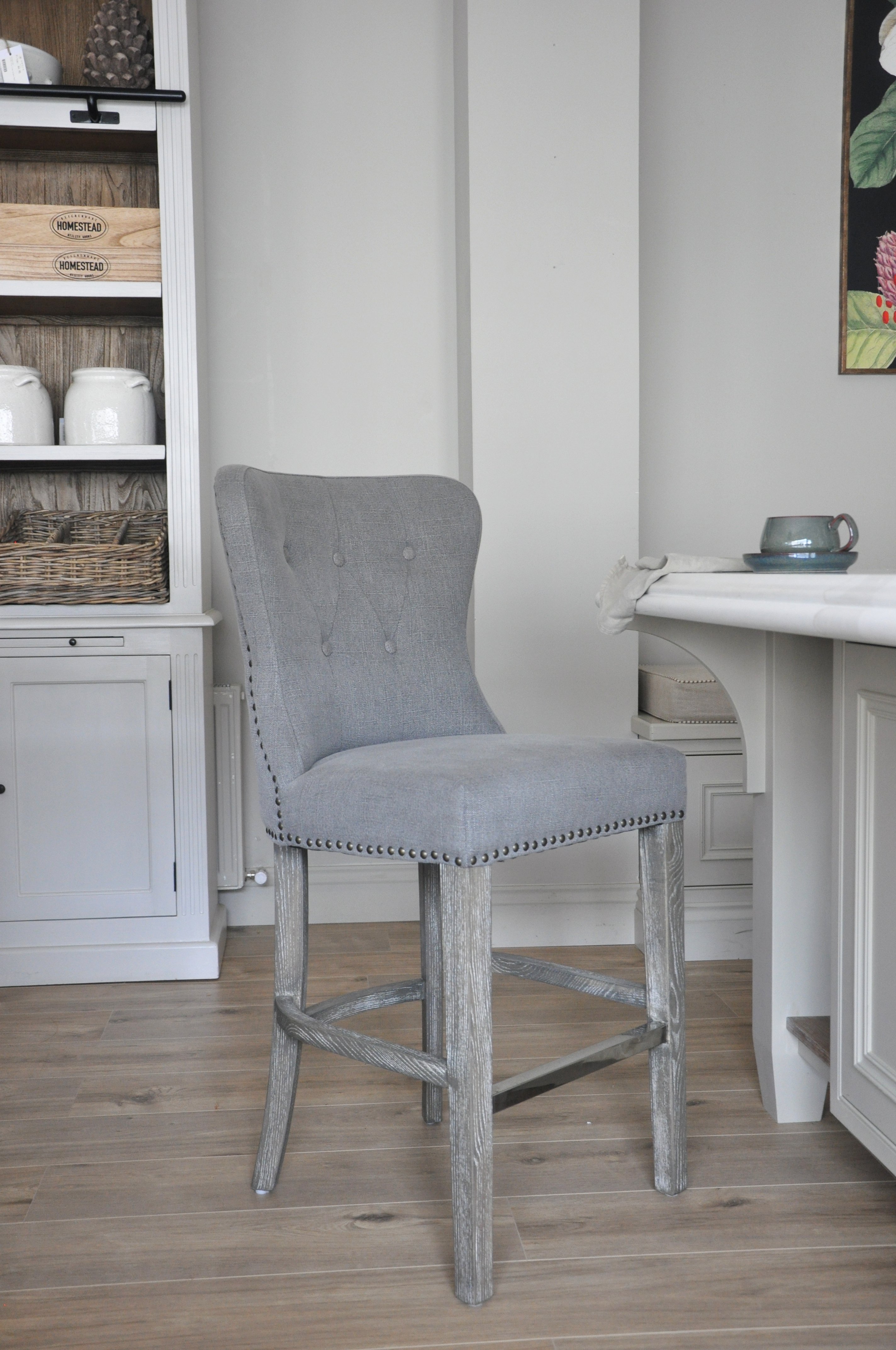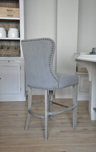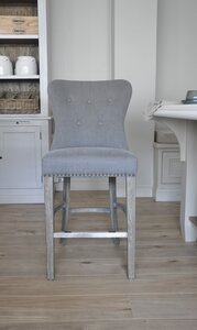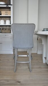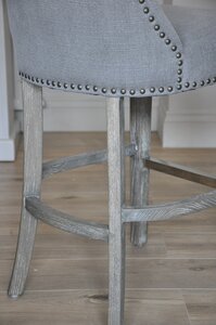 Beautifully upholstered, featuring bronze studding and grey wash legs, this counter stool would make a statement in any setting. Made from solid wood frame. Bronze knocker optional for the back.