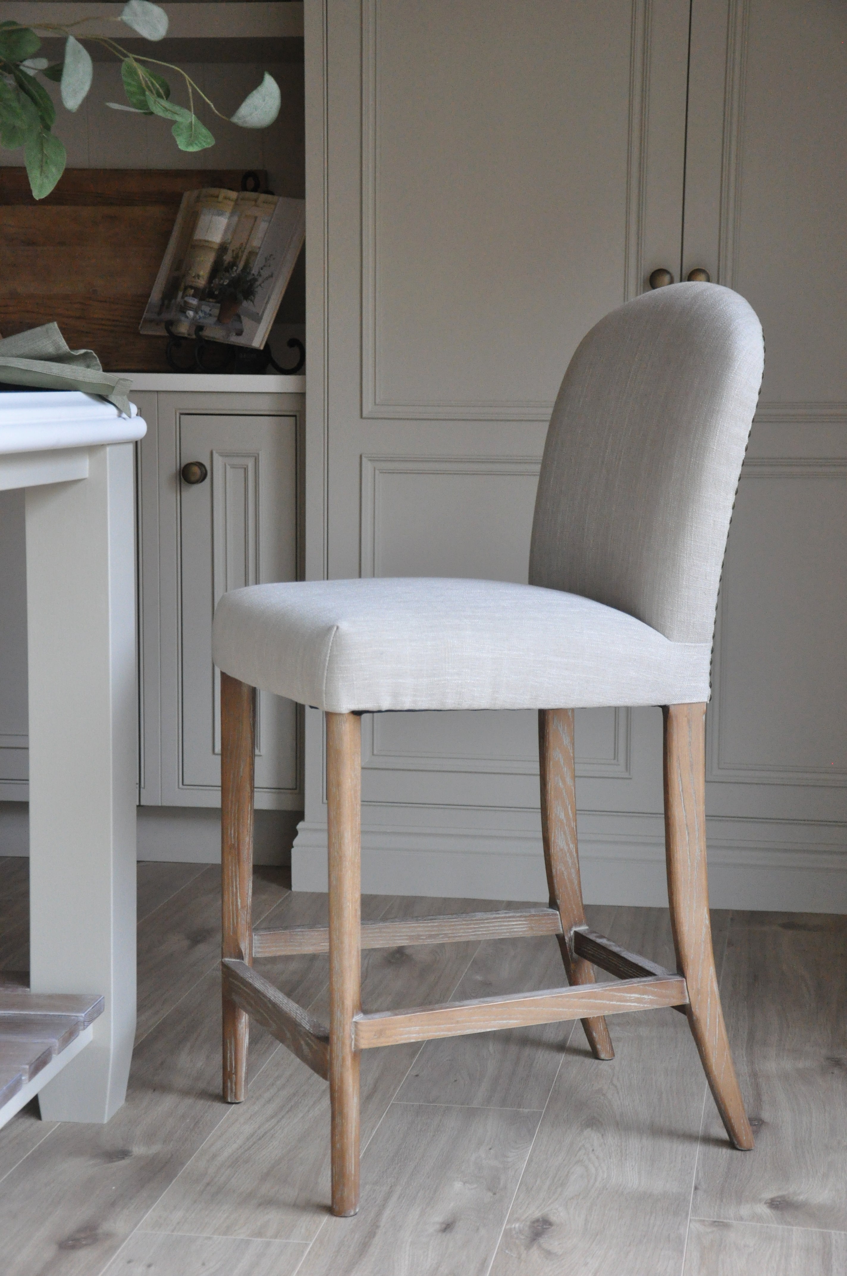 The Perry counter stool has been designed to provide a comfortable resting place whilst remaining neat in stature. Upholstered in a fine, linen-blend fabric with an accentuating studded detail on the back, this counter stool will quickly become the hottest seat at the breakfast counter.
