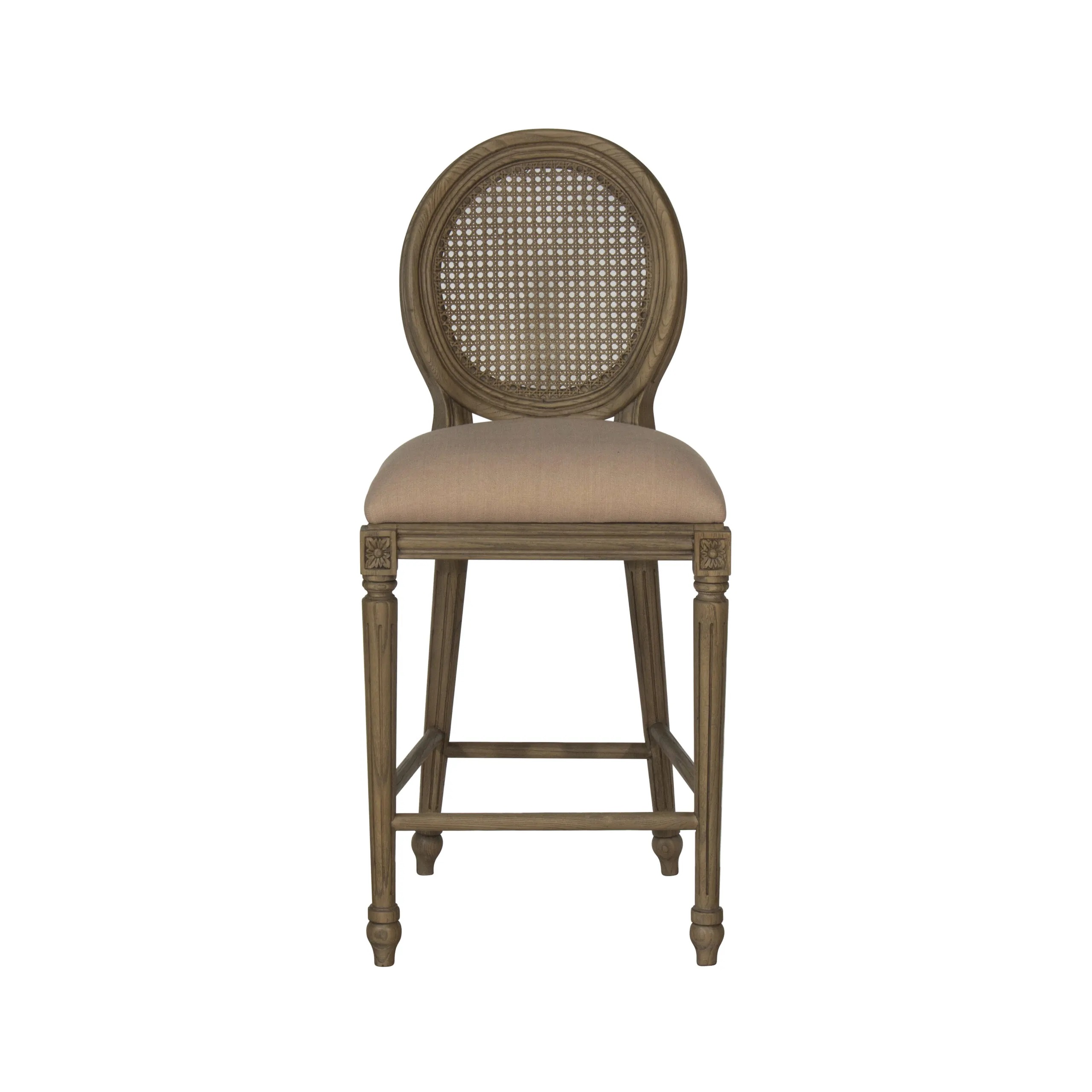 A stylish counter stool with a classic round rattan back and cushioned seat for added comfort. Crafted in dark oak with turned legs, perfect for adding warmth and elegance to kitchen islands.