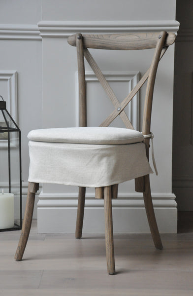 Our wonderfully elegant Wrenlow dining chair is part of our Grove exclusives range. Its beautifully simplistic design is contrasted by a highly textured finish, featuring a gently white washed wood with a matching linen cushion and skirt.